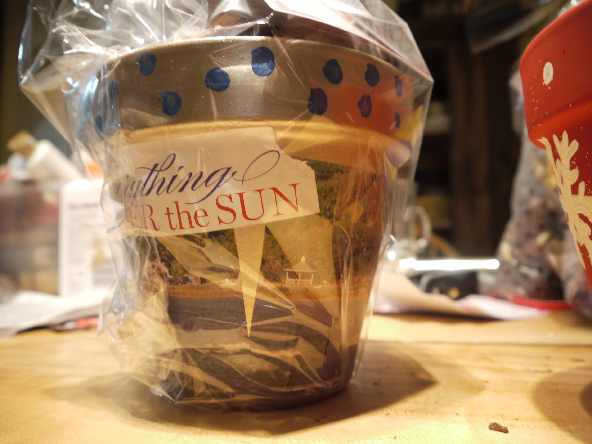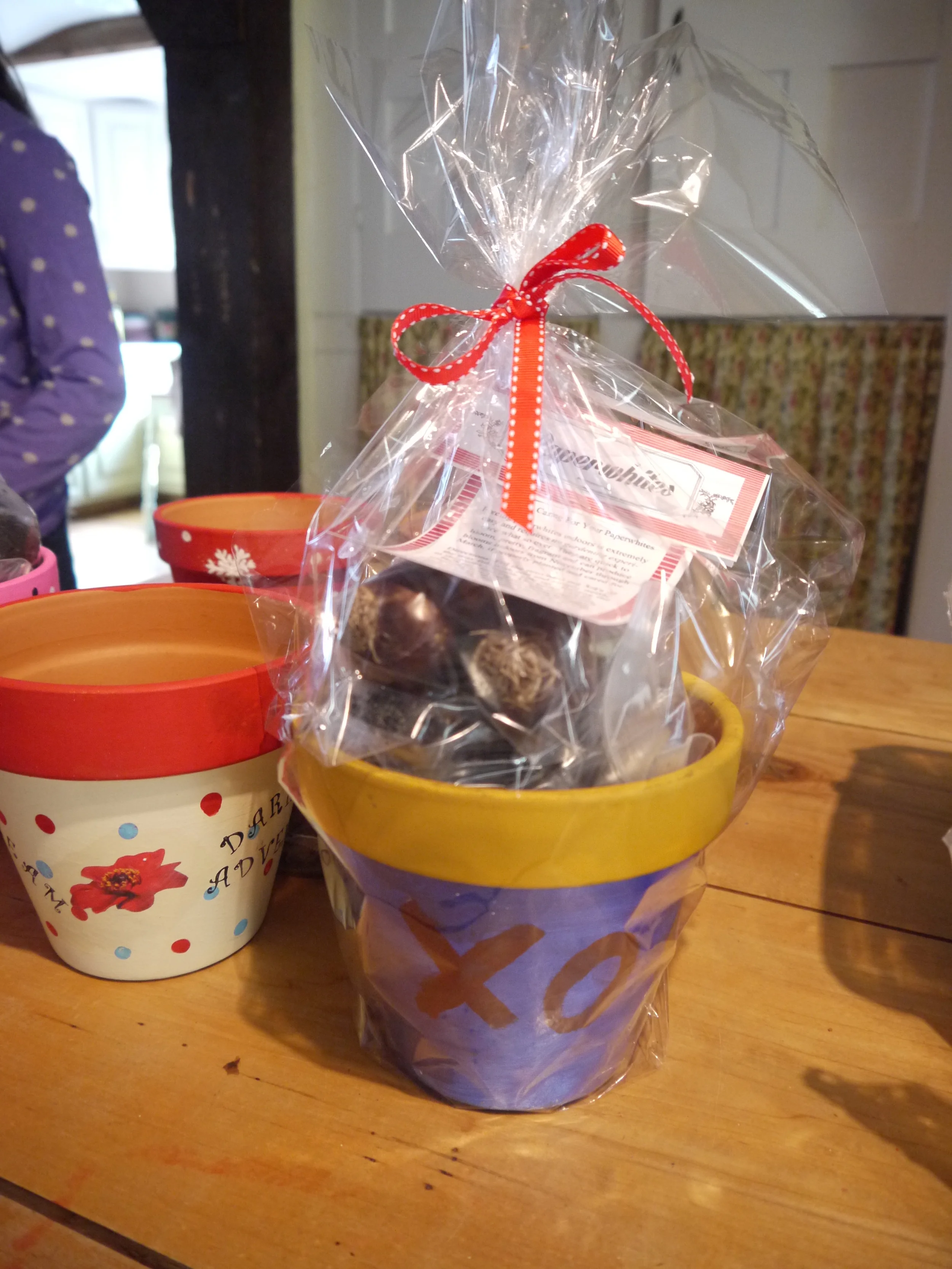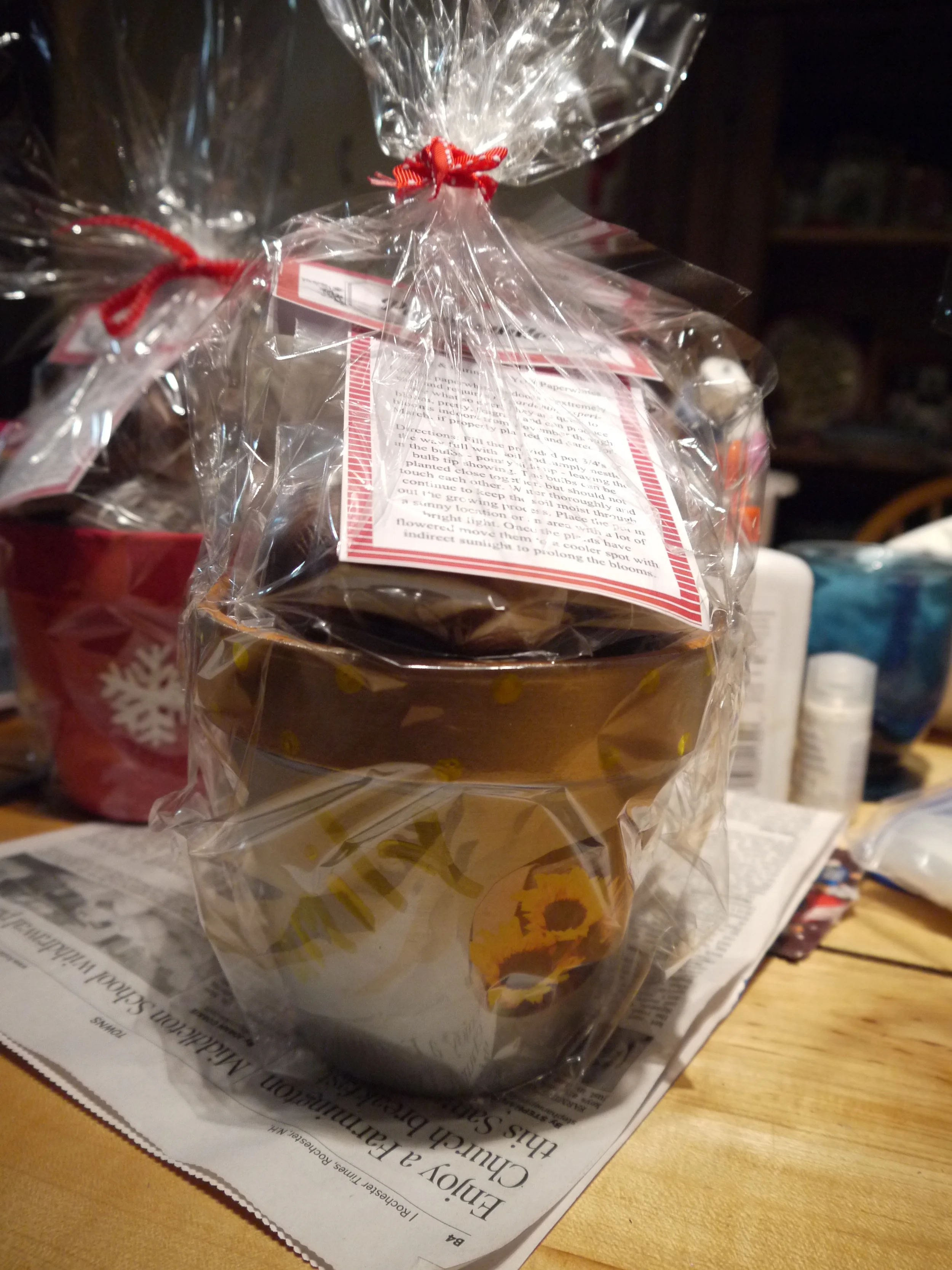 After the pot is completely dry you can put everything together. Put the potting soil bag in the pot, set the bag of bulbs on top of that,  and put the card with the instructions in the pot. If you have cellophane on hand cut a long strip about twice as wide as the pot and long enough to tie together above it. Tie on a bow and the tag and then tape the edges. That's it, you have a lovely handmade gift.