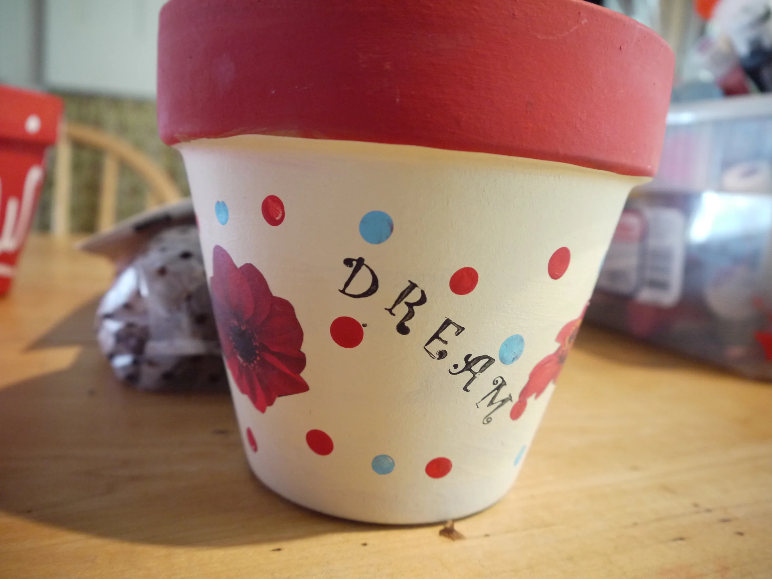 Then when the coat of paint is dry (it dries very quickly) put on a second coat if it is needed. If it isn't needed, you can just start decorating. You can add decoration with other colors of acrylics painting with reckless abandon, or if you are more of a reluctant creative, you can use pictures cut from magazines. Either way they turn out lovely. In the above photo, the flowers on the front pot are from magazines and the black and white scroll type design on the pink pot is from wrapping paper, see how easy this is? Cut your pictures out, trimming very closely. Then on a paper plate put some glue and add water to it to water it down. Using a paint brush, put the watered down glue on the back of the image and put it in place on the pot. Then brush the watered down glue all over the image (decoupage like). Don't worry, it will dry clear. You can also use Mod Podge for this but if you don't have any on hand, don't go spending money you don't have to, the glue works just fine.  For the polka-dots we used pencil erasers or q-tips, either works.