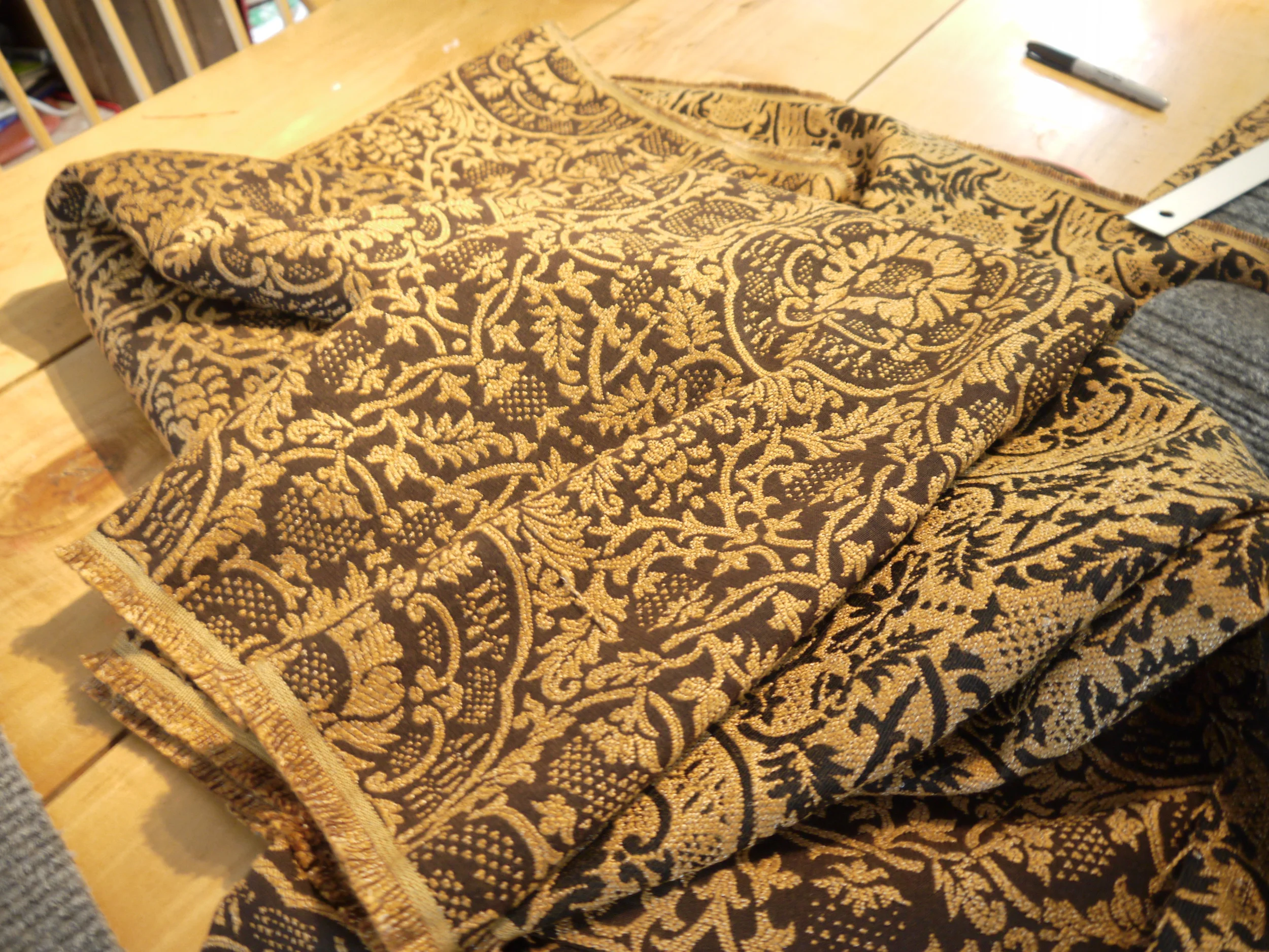Not being willing to spend that much, I put my thinking cap on. My daughter and I took a trip to our local salvage store, Mardens. They have upholstery fabric for unbelievable prices. I figured there has got to be a way to use that to make my own DIY stair carpet treads. So in taking a walk around the store, I found these: