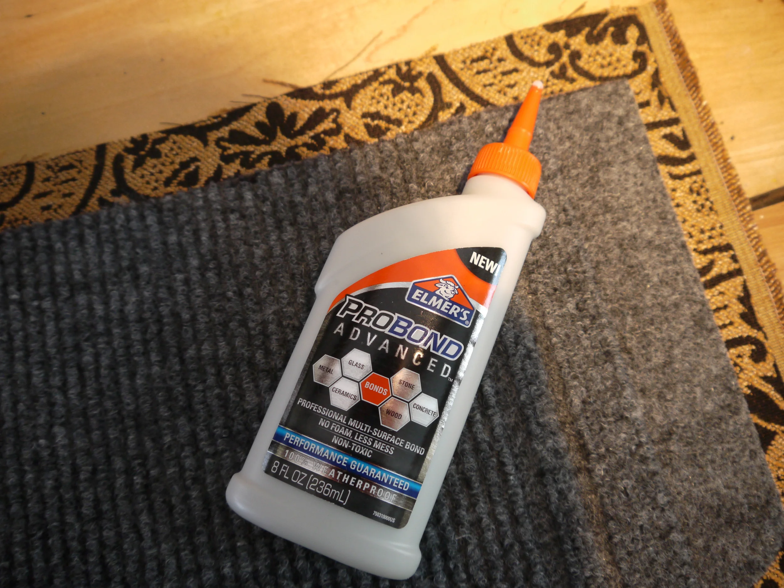 • Total:  $46.93    I think we may have been able to do this for a bit less if we had shopped around for a larger bottle or different glue. But overall I'm happy to not have spent a few hundred. Another thing which I considered using and you may want to try is, to use burlap to cover the carpet pieces and then use some geometric shape and acrylic paints to put maybe stars or stripes or some other design on the pieces.