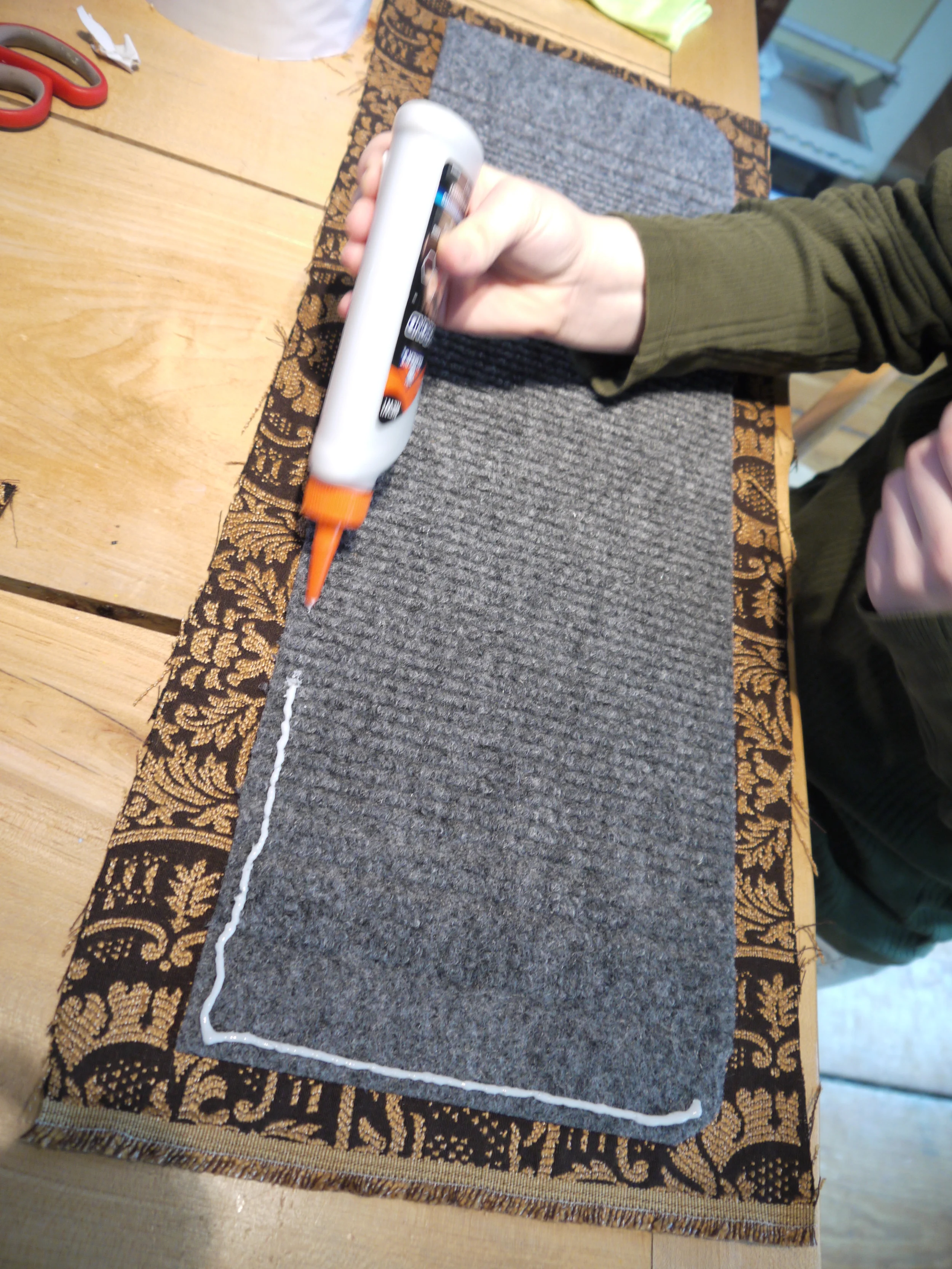 We spread glue all over the top (the carpeted side) of the carpet pieces