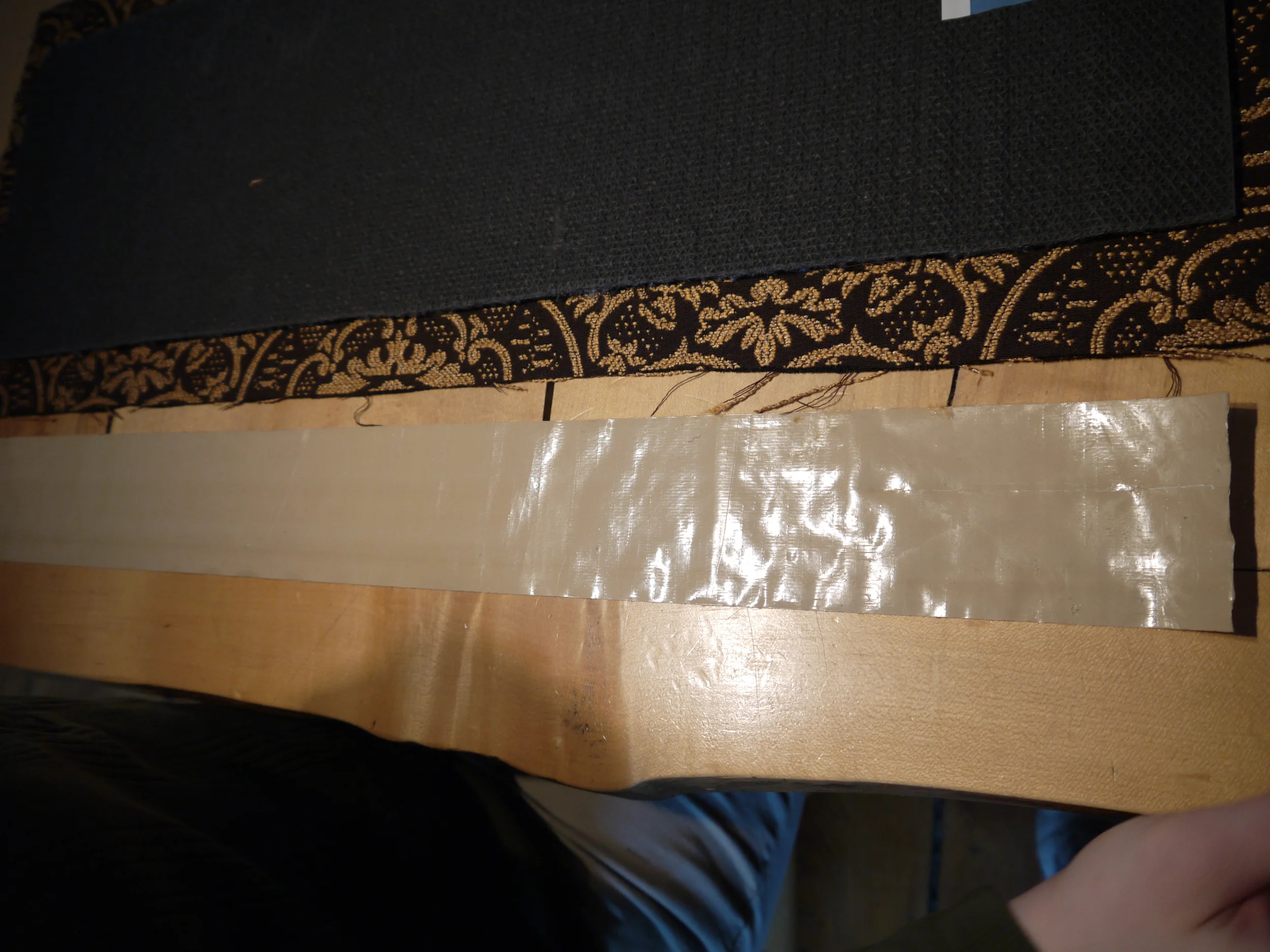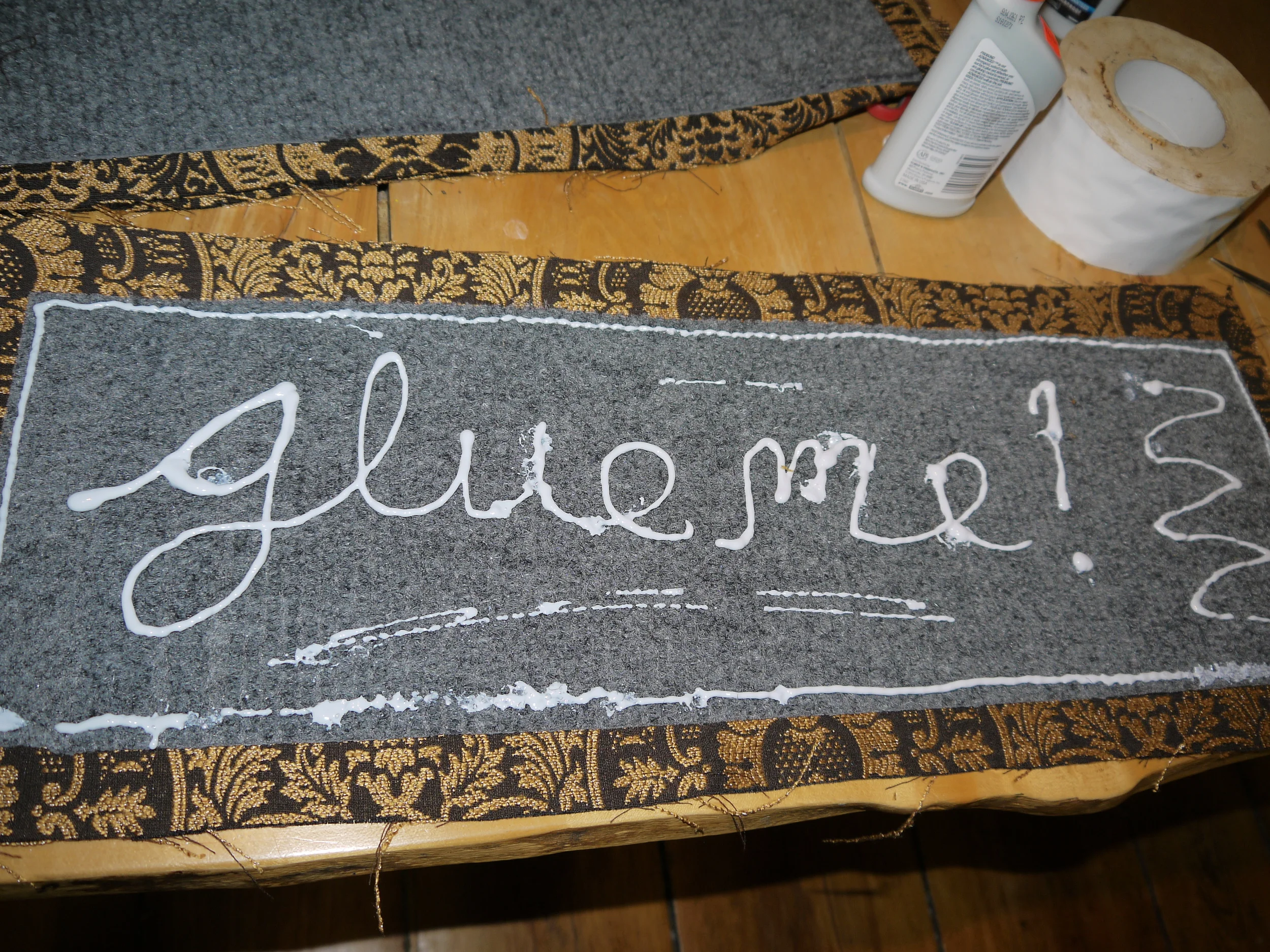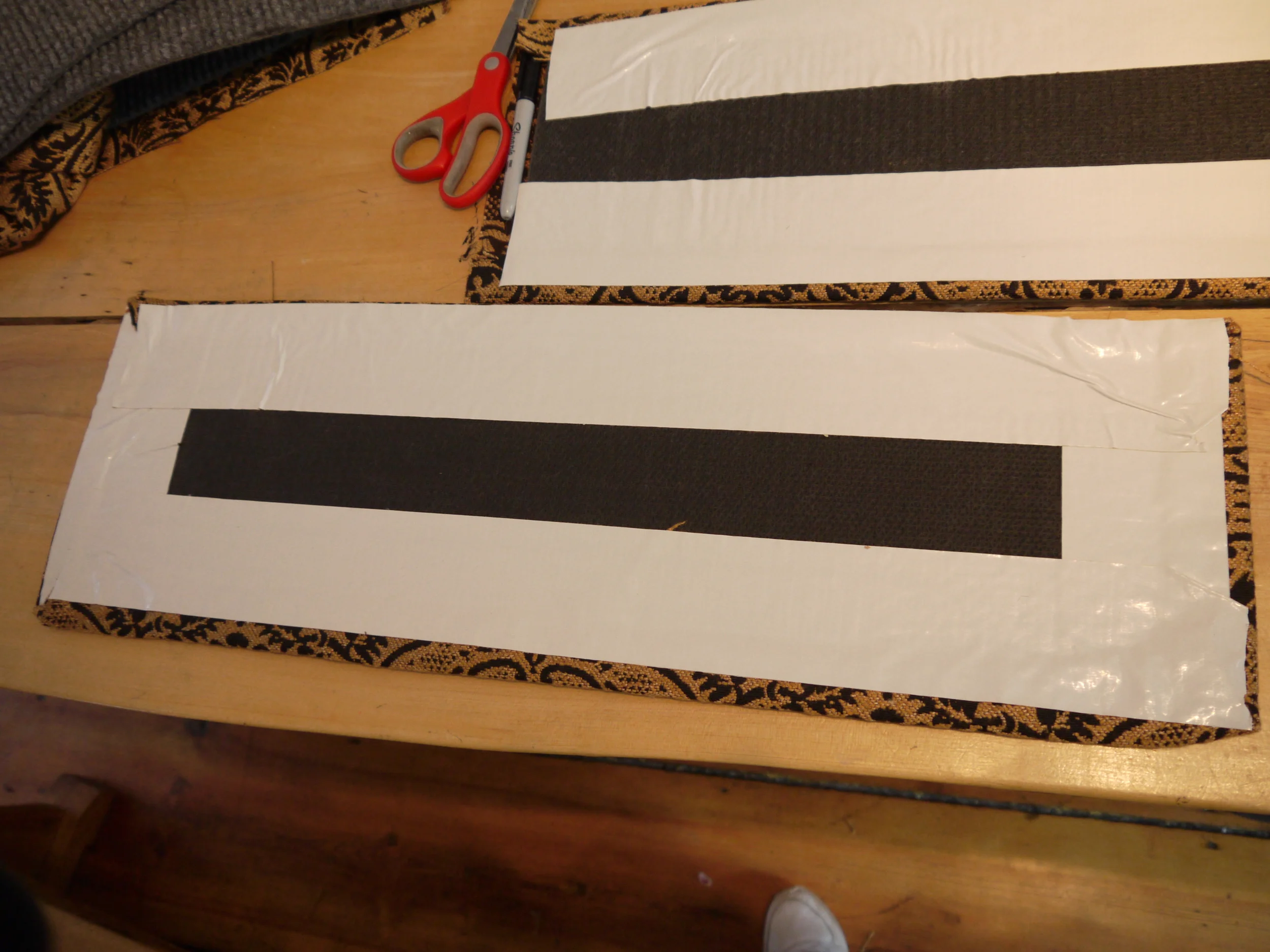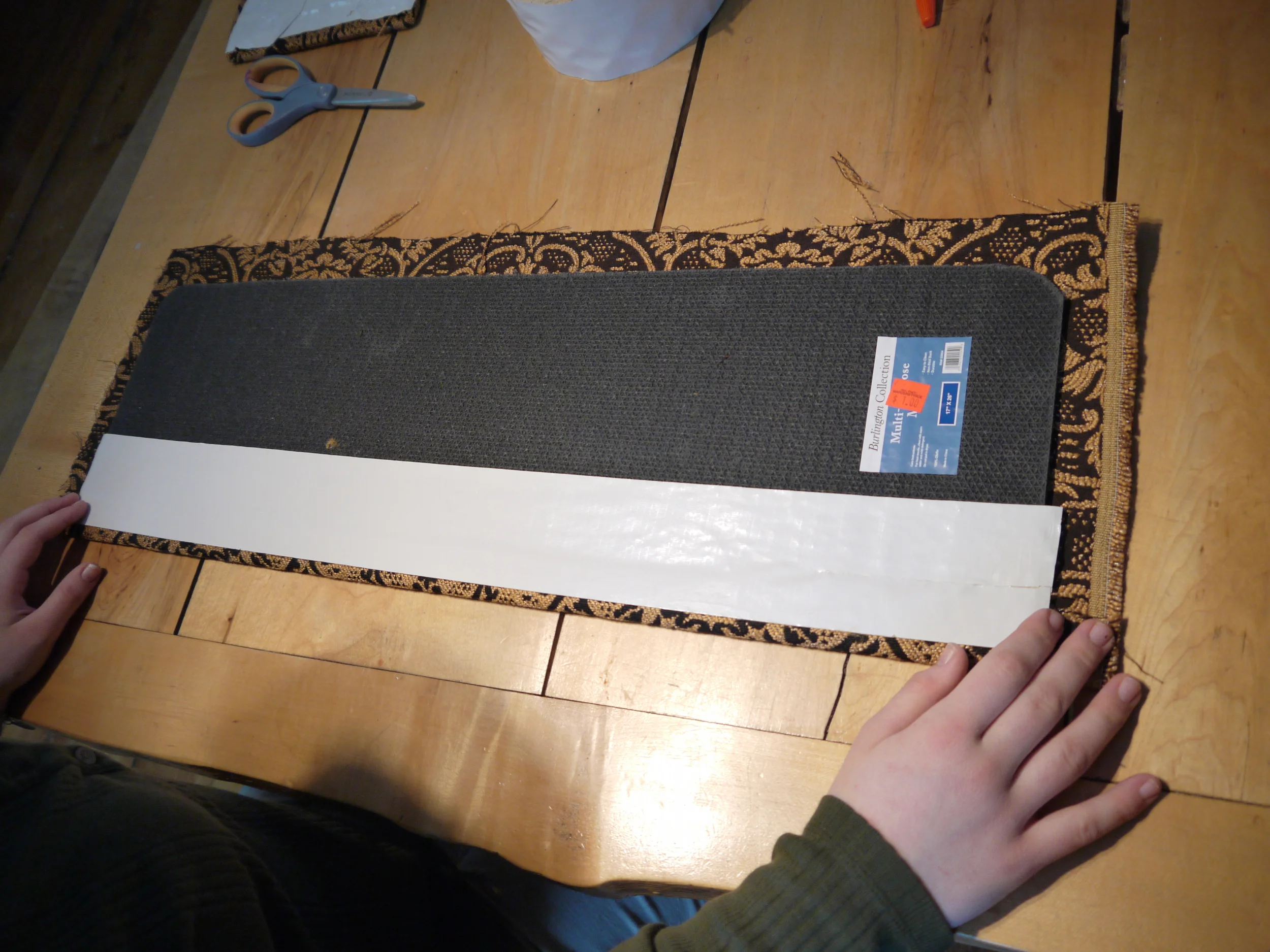 We then had to figure out a way to adhere the upholstery fabric to the rubber backed carpet pieces. In looking around the store my daughter and I found two things, glue and tape...crazy strong tape. I don't know what the tape is used for but the stickiness of it makes duct tape seem like a wimp. Sorry duct tape, I still love you and was going to use you if I had not come across your bigger, stronger, super hero cousin. I know someone will ask but I have no idea what this tape is.  Mardens is a salvage store, this role had no packaging and looked just like this when we bought it. But it was huge and the price was right at $3.49.