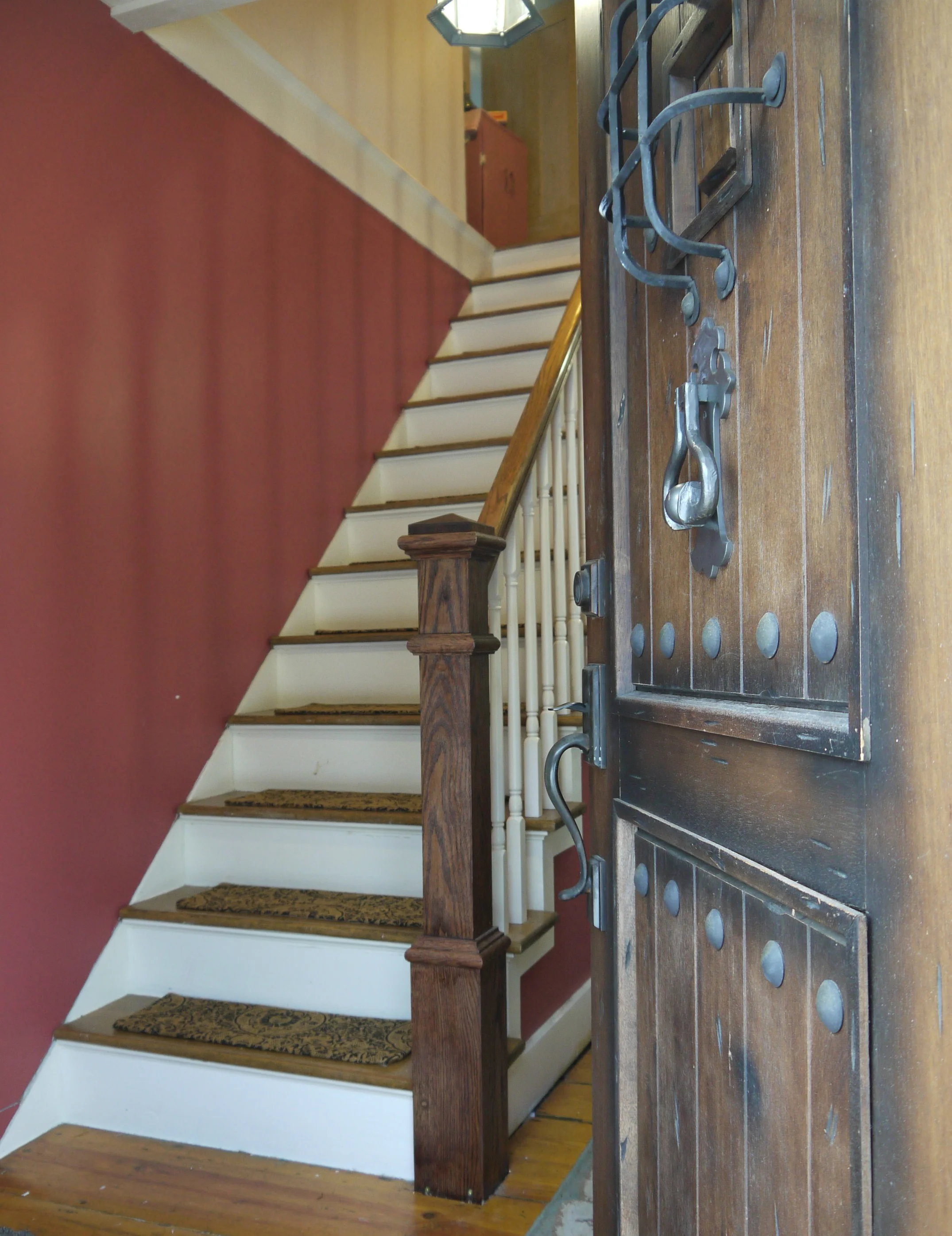 I have had soooo many questions asked about these carpeted stairtreads so I thought I would add an update. Just over a year after I made these, we sold the house. So, unfortunately I can't tell you much beyond 1 years wear. However, I can tell you how they held up through that year with a family of 6 and 3 large dogs. They held up AMAZINGLY well! I did not think to take a photograph of them before we moved. However, I do have the realtor photo. Unfortunately it isn't the clearest photo for zooming in. But I can tell you they looked good enough that I didn't feel a need to do anything with them except vacuum in order to show and sell the house, I think they made the front hall look very pretty. The realtor photo is below. To answer some of the specific questions I have been asked: