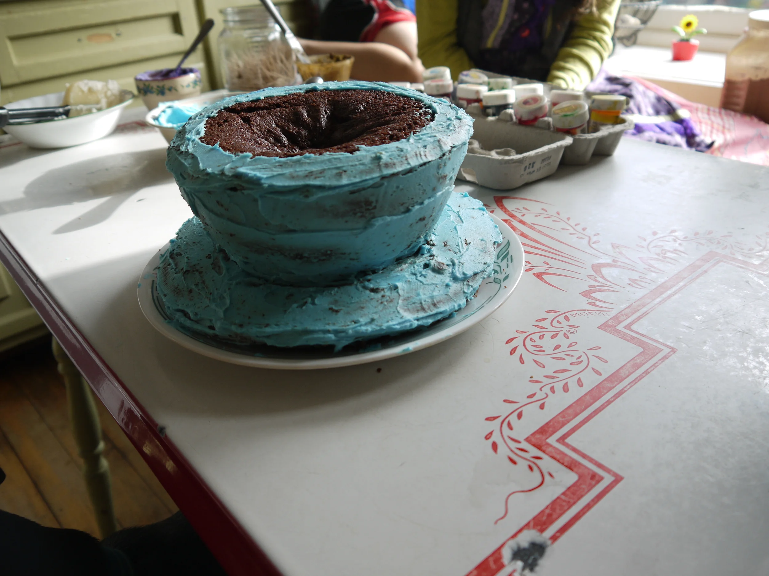 If you've never done a shaped cake before, it's very simple, it's more about the illusion than for the cake to look exactly like the item.  I know my cake has a hollow in the center in the top where the cake settled a bit, but we have a plan for that.