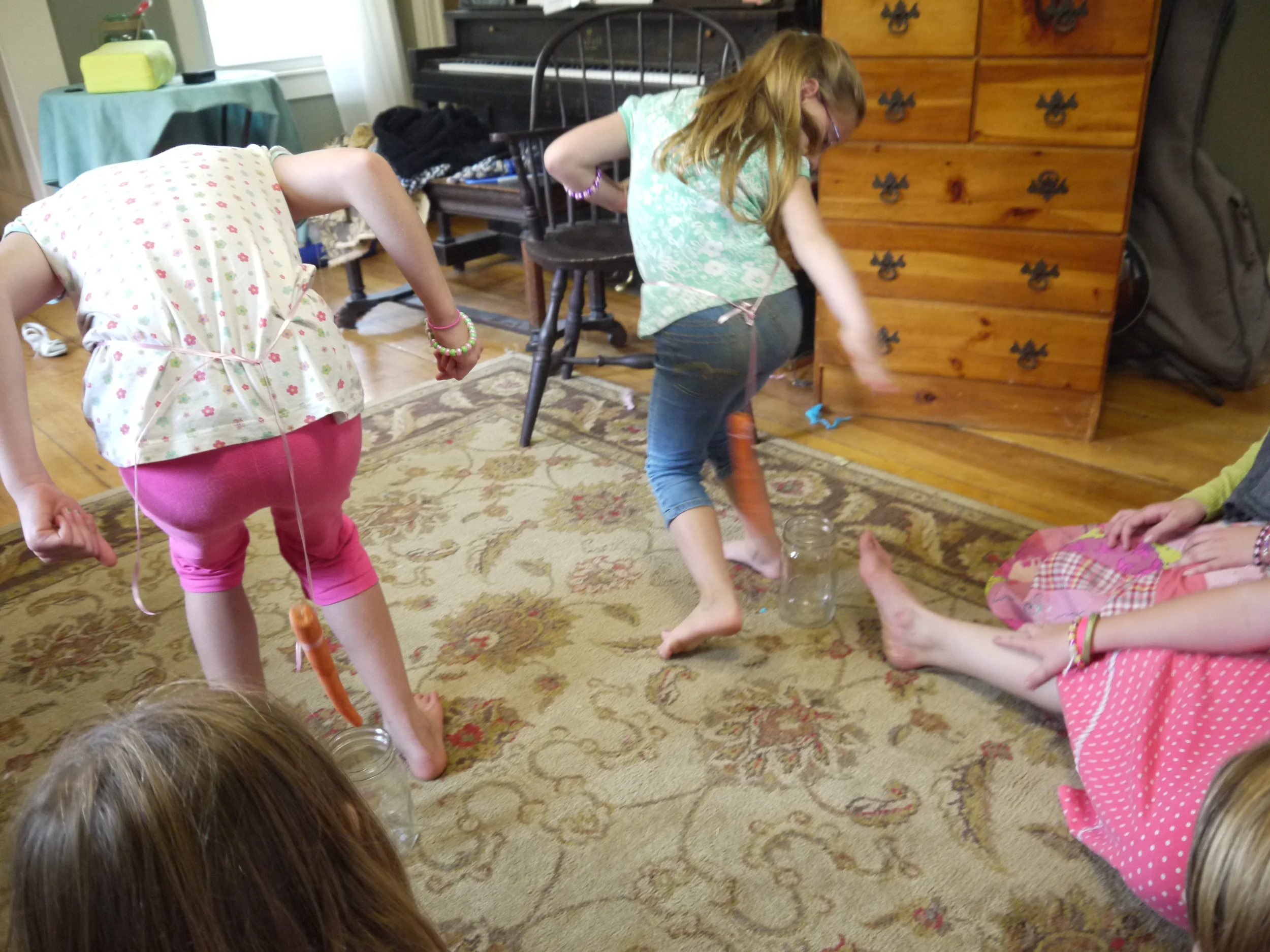 This is a game my mother use to have us play at my birthday parties when I was a child, and we loved it. I have used this game with both children and adults and I have used at a townwide harvest event and it was well received. So if you are looking for something new and silly, give this a try. First, you tie some curling ribbon or twine around the victims, I mean the participants, waist. Then you tie a piece hanging down in the back kind of like a tail. At the end of the piece of twine, tie on a carrot. Have each player squat over a jar, I used wide mouth canning jars but smaller mouth jars are more challenging. Each player must squat down and try to be the first to get their carrot in the jar....pure silliness, guaranteed laughs. If you want to add more challenge to this: give the carrot a good swing just as you say "go". The higher up you tie the carrot, the more challenging, but don't tie it up so high that they can't see it if they look through their legs or twist to the side. Like I said, you can't escape looking silly playing this game.